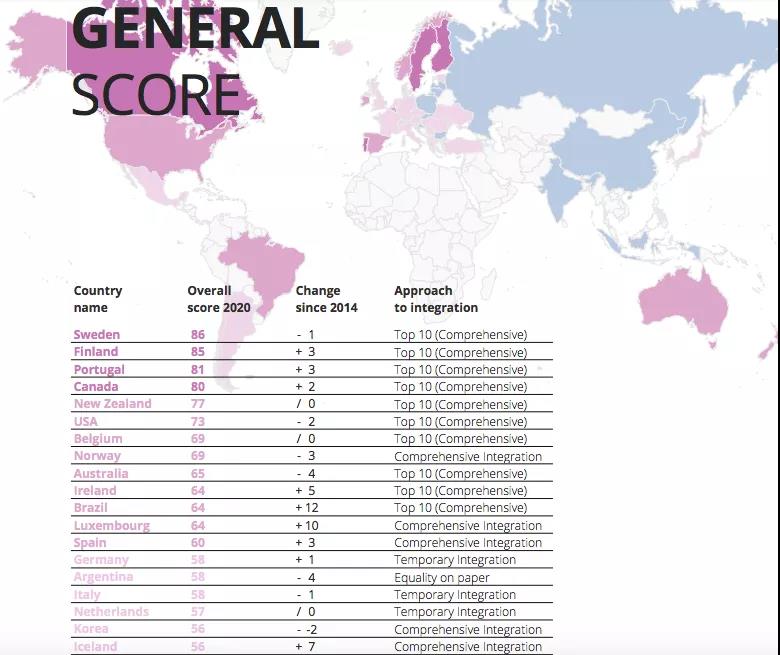 近日,欧洲最大的移民融合领域学者网络IMISCOE发布了《全球移民融合政策指数》(MIPEX),凭借着严谨性和专业性,MIPEX一直以来都是欧洲公认的移民参考指南,该指数报告通过综合性国际参数标准,对全球52个主流移民国家对移民的接纳程度进行了打分排序,移民融合政策指数的研究参数共计167项,对全球52个主流移民国家进行八个指标评分,分别是: