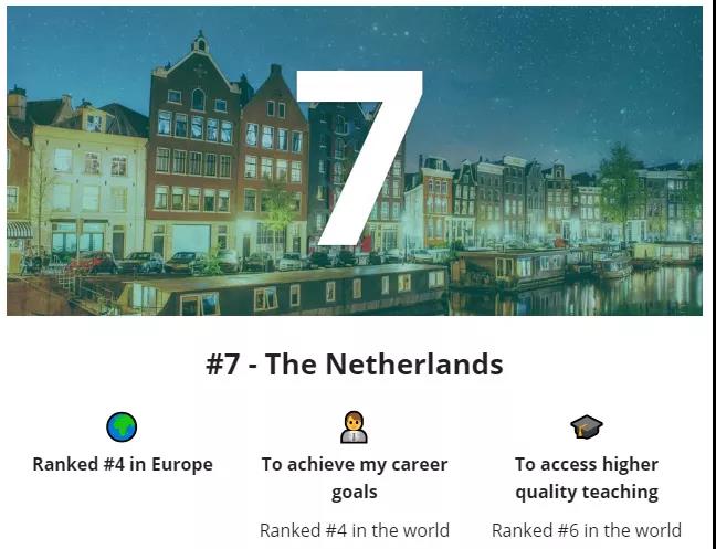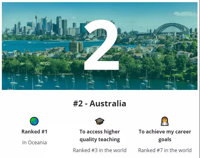 在以30000名国际学生为调查样本的这项研究中,大部分调查者考虑决定留学目的地,优先选择的是国家,而不是某一所大学或者特定专业。这份排名也不像QS那样,注重学术;这份排名注重的是留学生的体验感和职业目标的实现。