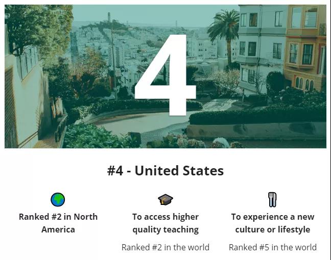 对于许多留学生来说,美国坐拥着令其趋之若鹜的科研教育优势。也因此,它在“获得高质量教育”方面排第二。