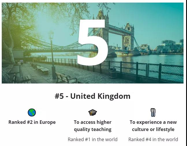 英国在“获得更高水平教学”这一项上位居榜首:牛津剑桥两大王牌学府、G5金砖五校,再加上又是世界金融中心,这些全球顶尖的优质资源吸引着来自全球各地的留学生。