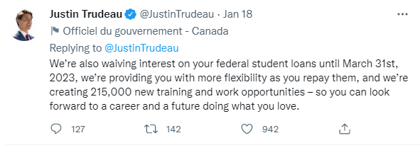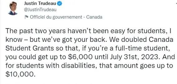 特鲁多发推提醒:“加拿大学生助学金”(Canada Student Grants)这项福利的金额已经翻倍。