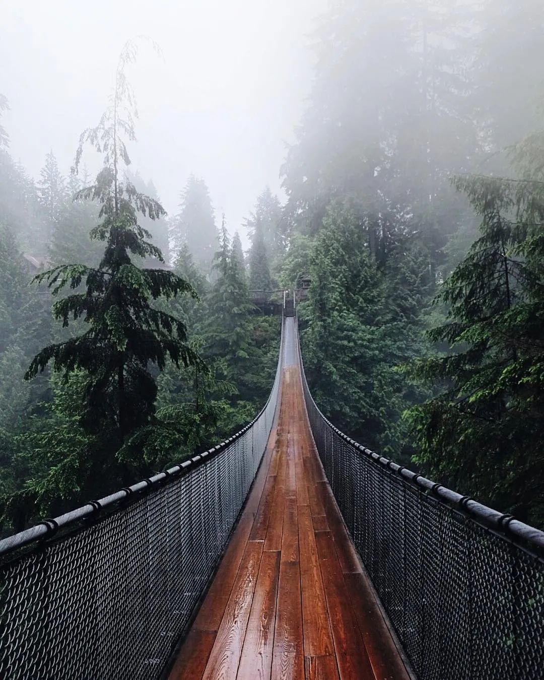 被雨打湿的卡佩兰奴吊桥公园,亮晶晶,湿漉漉的,有一种晴日里没有的朦胧美。