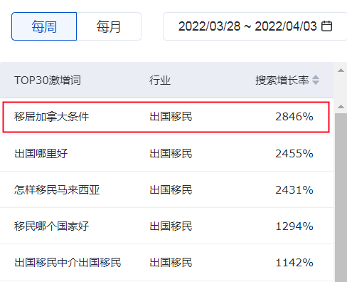 而近期,有关加拿大移民、美国移民的搜索指数更是直线激增!根据百度最新公布的周数据,【移居加拿大条件】词条搜索暴增2846%,冲上“热搜榜”!“出国哪里好”,以2455%增长率排在第2名。