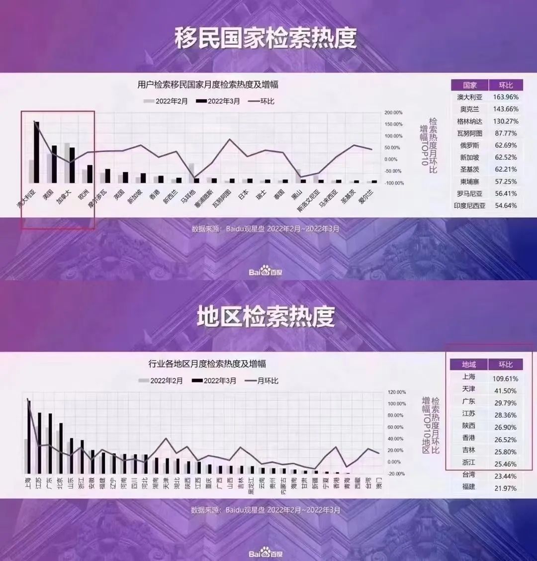 根据百度搜索2022年一季度数据显示,用户在检索移民目的地时,澳大利亚、美国、加拿大、欧洲轮番占据前四位。