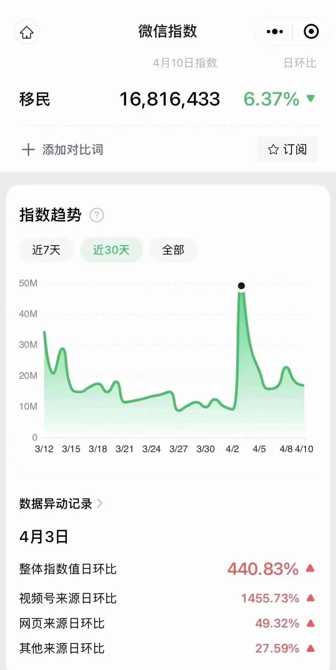 4月3日,“移民”中文关键词数据日环比暴增440%,单日搜索量达到了惊人的近5000万次。相当于每20个微信用户中,就有1个在4月3日当天搜索了“移民”。