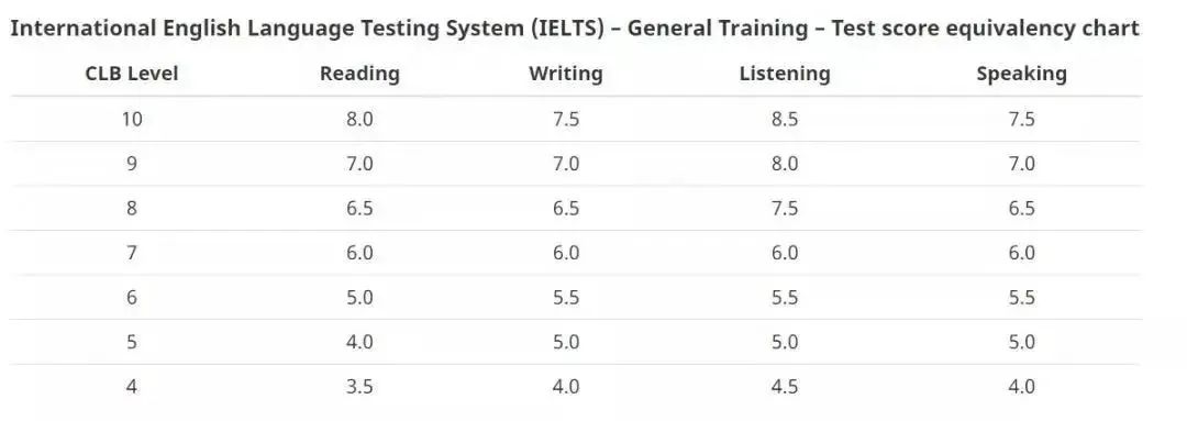 ▲ CLB等级对应的雅思分数
