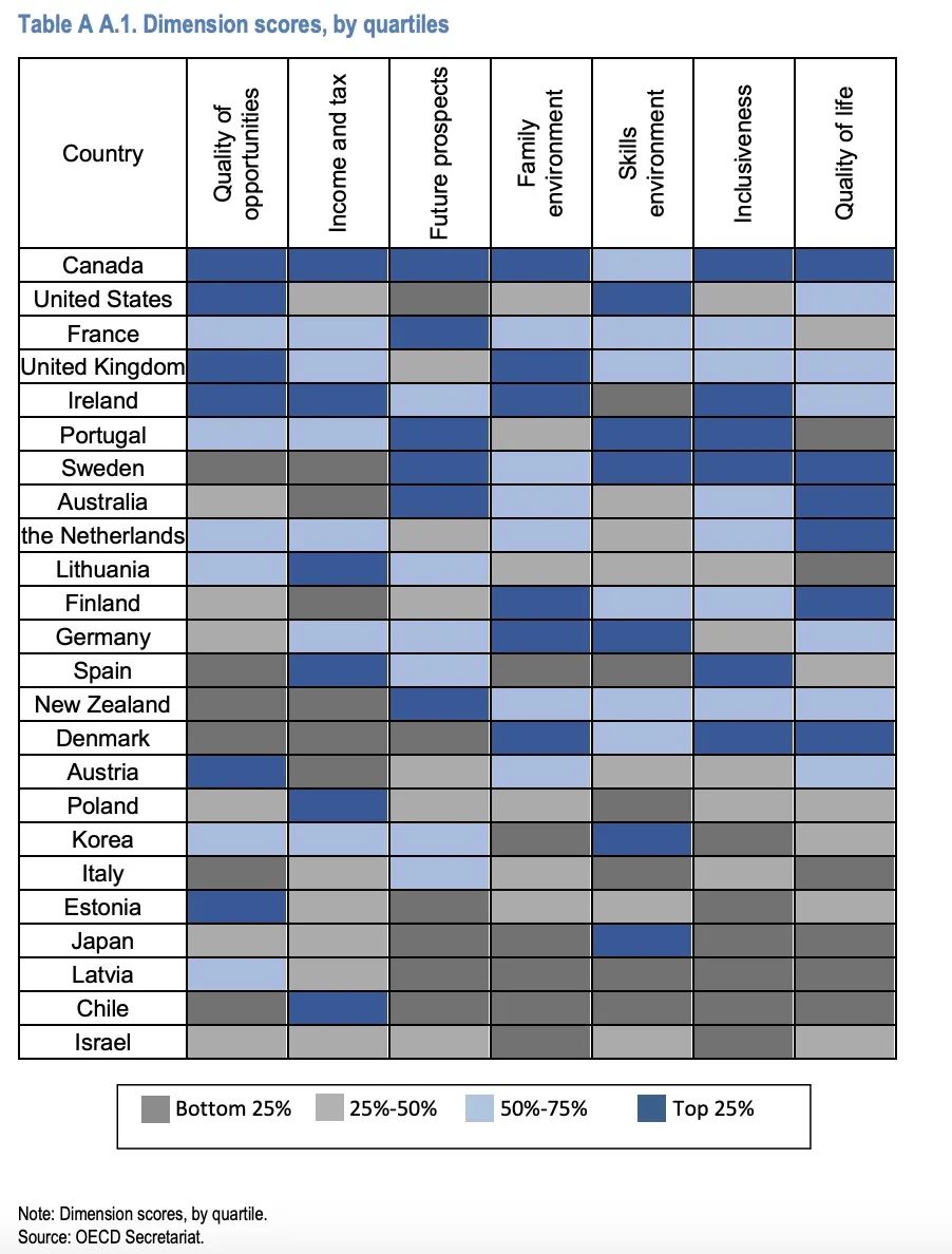 据悉,OECD的人才吸引力指标是一个排名系统,重点关注通过考虑一般因素和特定移民政策来吸引外国创业者。该系统包括七个核心维度,即机会质量(Quality of opportunities)、收入和税收(Income and tax)、未来前景(Future prospects)、家庭环境(Family environment)、技能环境(Skills environment)、包容性(Inclusiveness)和生活质量(Quality of life)。
