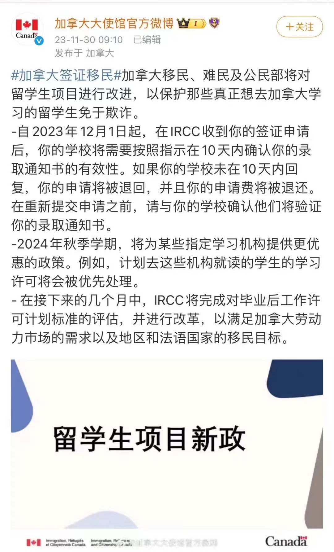 最近,加拿大移民、难民及公民部(IRCC)宣布了对留学生政策的改进,旨在保护真正希望前往加拿大学习的留学生们免受欺诈。据此,加拿大大使馆官方微信账号也发布了相关信息。