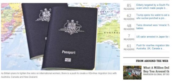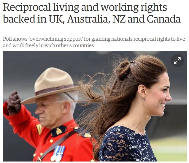 从目前来看,加、澳、新,英四国签证互通提议进展十分顺利。英联邦协会在四个联盟国举行了全民投票支持率显示,84%的被调查者支持这项"签证,移民互相承认"的计划。