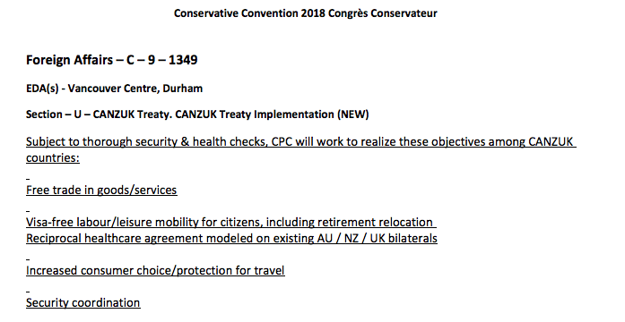 加拿大最大的在野党-保守党昨天通过了提案,支持CANZUK(加英澳新四个国家之间公民、贸易自由流动)政策。