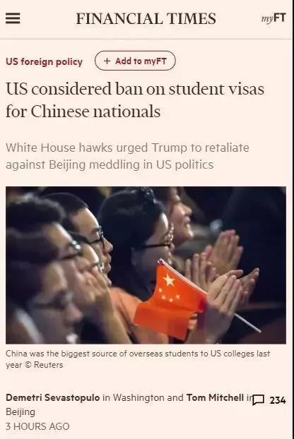 最早的报道始于美国媒体《Financial Times》,消息一出,中国留学生和家长大惊失色,美国要禁止中国人留学了?!文中称,特朗普在今年早些时候就想停止向中国公民提供学生签证,但是白宫担心经济和外交收到影响而搁置。