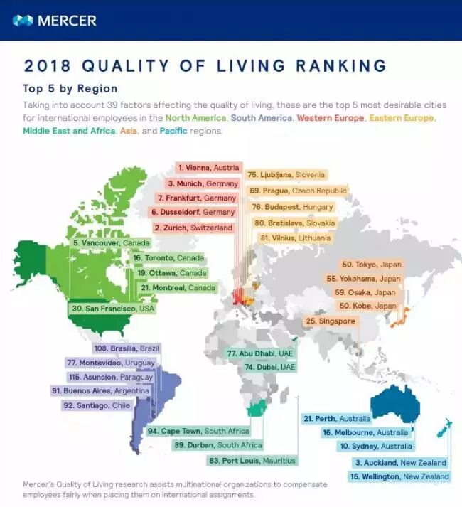 该报告比较了稳定性、医疗保健、文化与环境、教育、基建5大生活指标,评估了全球140个城市。
