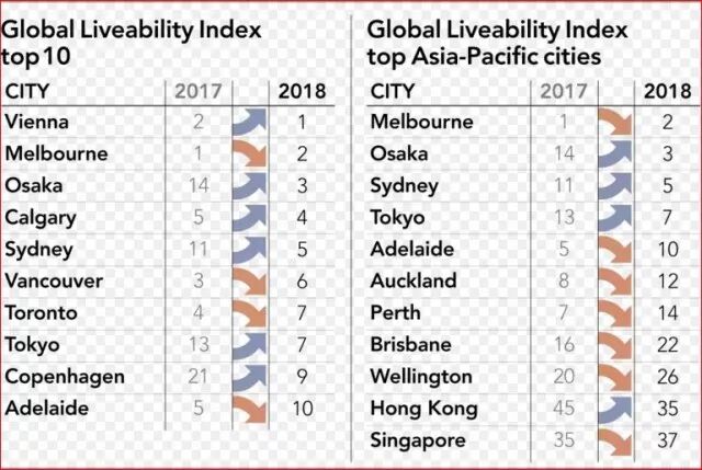 连续赢得七年该排行榜榜首的澳洲墨尔本今年最终被多年跟随其后的奥地利维也纳打败,维也纳以99.1分夺冠。