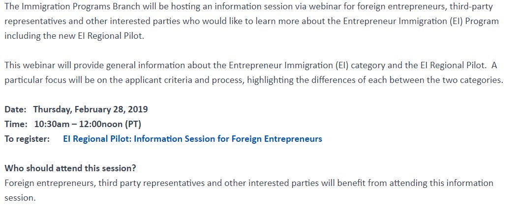 最近BC省移民局官网做出更新,宣布2月28日将召开一个面向投资人的网络会议,公布Entrepreneur Immigration - Regional Pilot项目的细节!大家敬请期待吧!