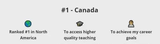 To access higher quality teaching(高质量的教学)分数权重24.6%To achieve my career goals(实现我的职业目标)分数权重22.5%To develop myself personally(自我发展)权重16.7%To experience a new culture or lifestyle(体验新的文化或生活方式)权重15.9%To have an adventure(冒险)权重7.5%To learn a new language(学习一门新语言)权重6.5%To make new friends or widen my professional network(结交新朋友或扩大我的专业网络)权重6.3%在这些维度中,加拿大“教学质量”这一栏排名世界第4、“实现自我职业价值”排名世界第6,虽然没有特别高的分项,但胜在实力均衡!