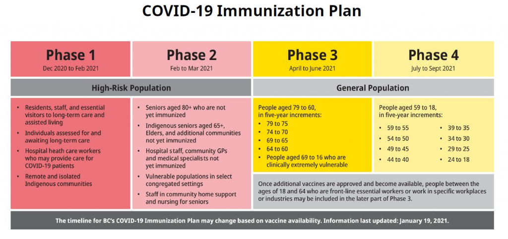 BC省的疫苗接种将分4个阶段进行,已从2020年12月开始实施。