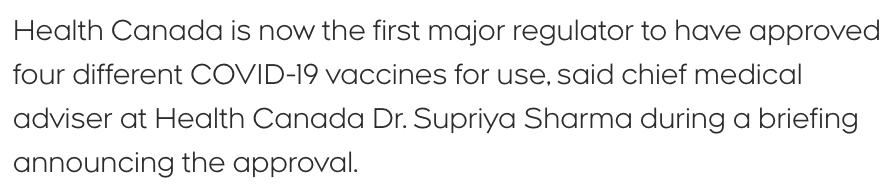 加拿大将成为世界上第一个通过四款不同疫苗(辉瑞、Moderna、强生和阿斯利康)接种的国家。