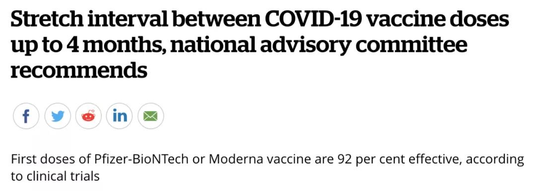 其次还有一个很重要的原因,各省可以选择将辉瑞和Moderna疫苗的注射间隔最多四个月的时间。加拿大国家免疫咨询委员会(NACI)建议,在疫苗供应有限的情况下,各省和地区可以将第一剂和第二剂新冠状病毒疫苗注射间隔时间延长至4个月,可使更多人受益。
