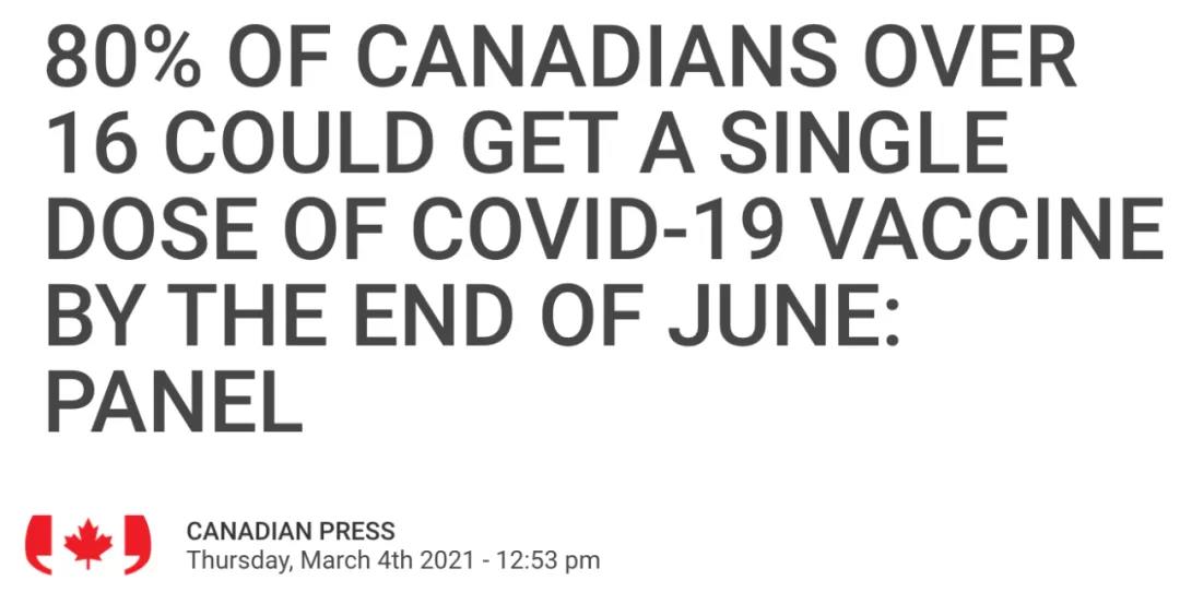 在此背景下,加拿大多个省份的疫苗进度迅猛加快。预计80%年龄在16岁以上的国民可以在6月底之前接种第一剂。