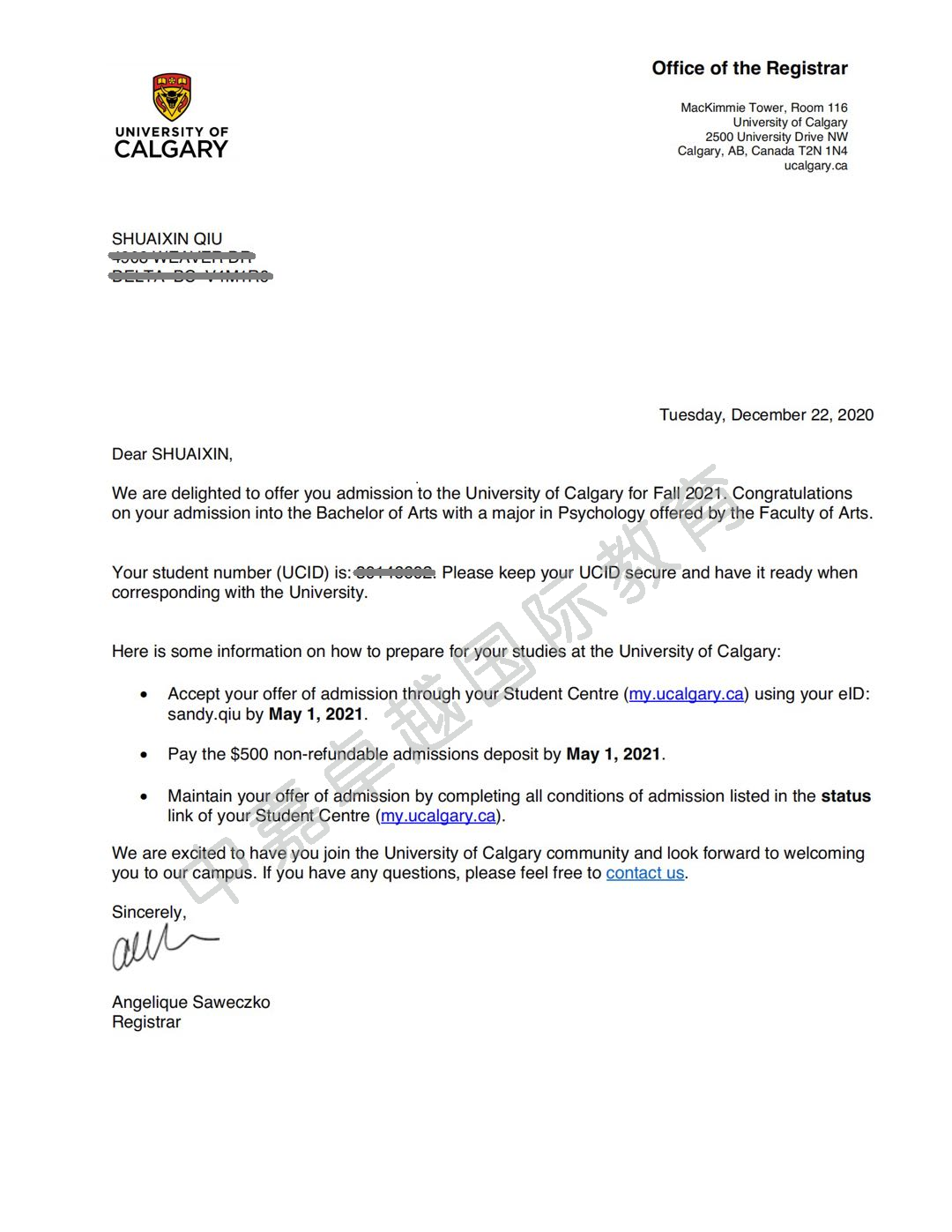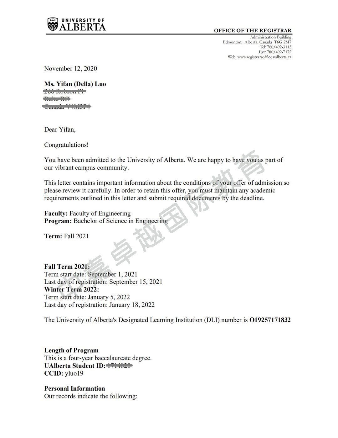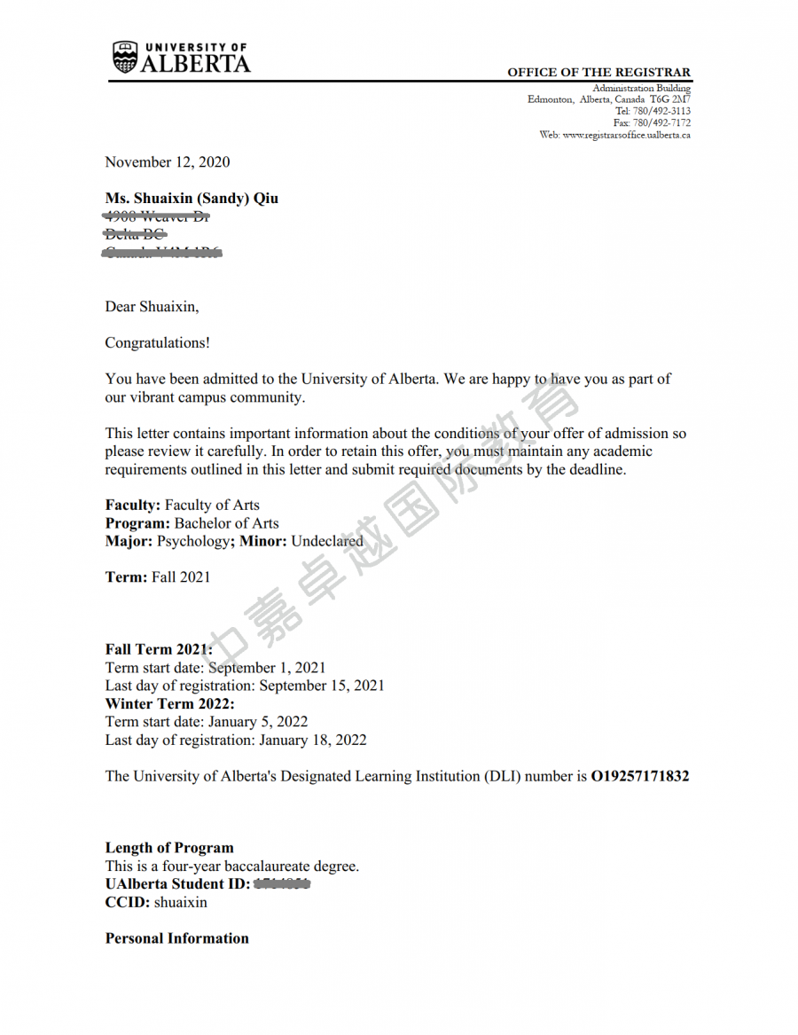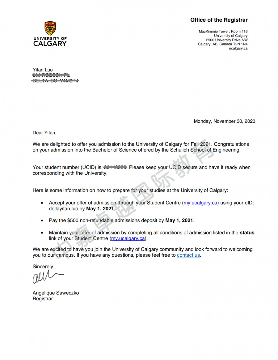2018.9-2021.6在加拿大高中学习,修业三年。罗轶凡同学成绩优异,申请目标明确,只申请了阿尔伯塔大学和卡尔加里大学,已经收到这两所大学工程学院的录取通知书。阿尔伯塔大学加拿大排名第四,工程学院享誉全球,是工程师的摇篮,该学院的毕业生就业前景好,薪资高。只要拿到该校毕业证书,高薪职位和移民身份唾手可得。罗轶凡同学还得到了阿尔伯塔大学的一万五千加币奖学金。